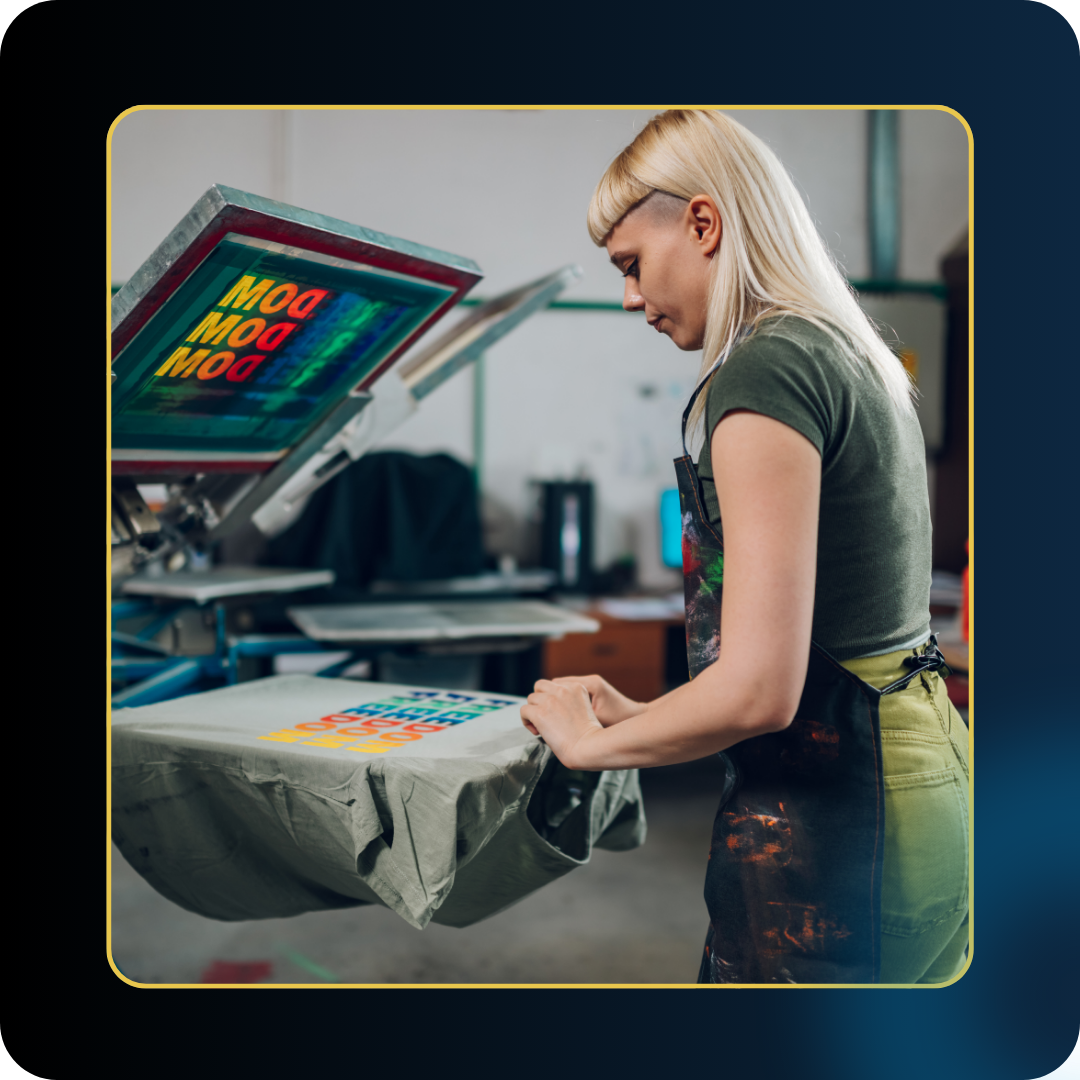 Used across garments, tote bags and even some rigid products. It’s ideal for bold, solid designs and larger volumes. When done well, it’s clean and durable.